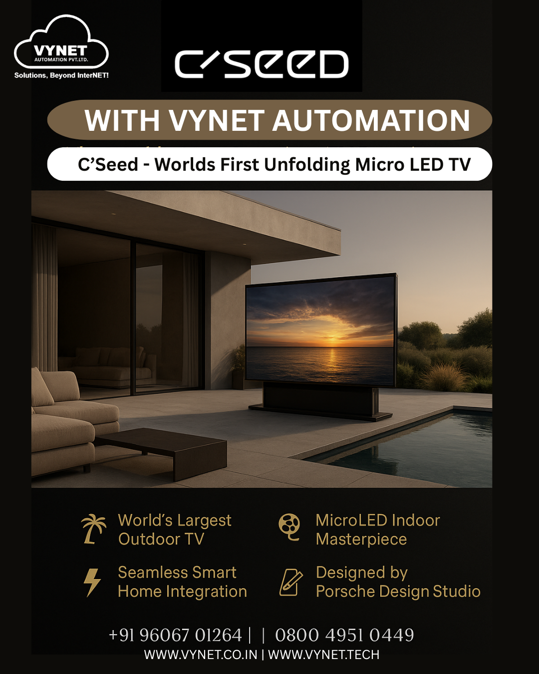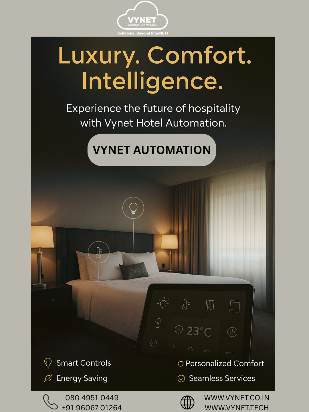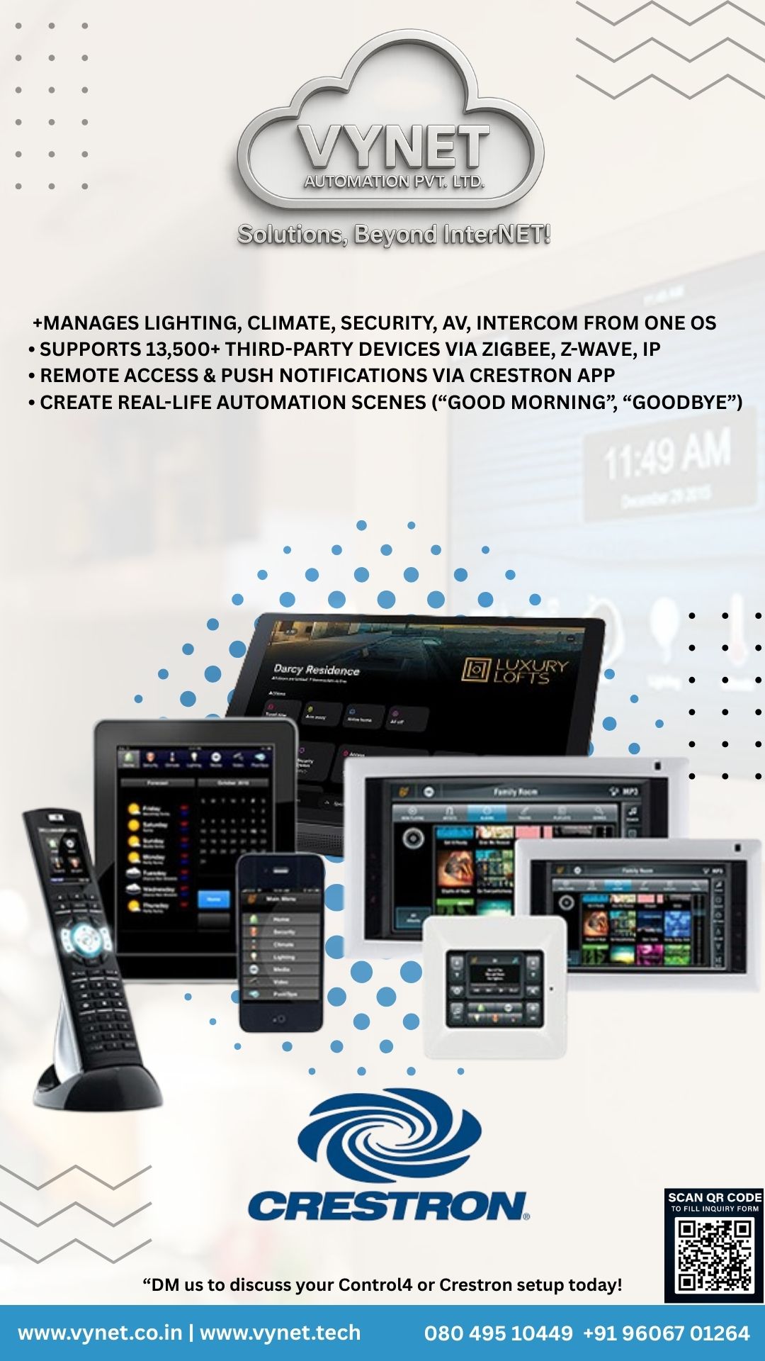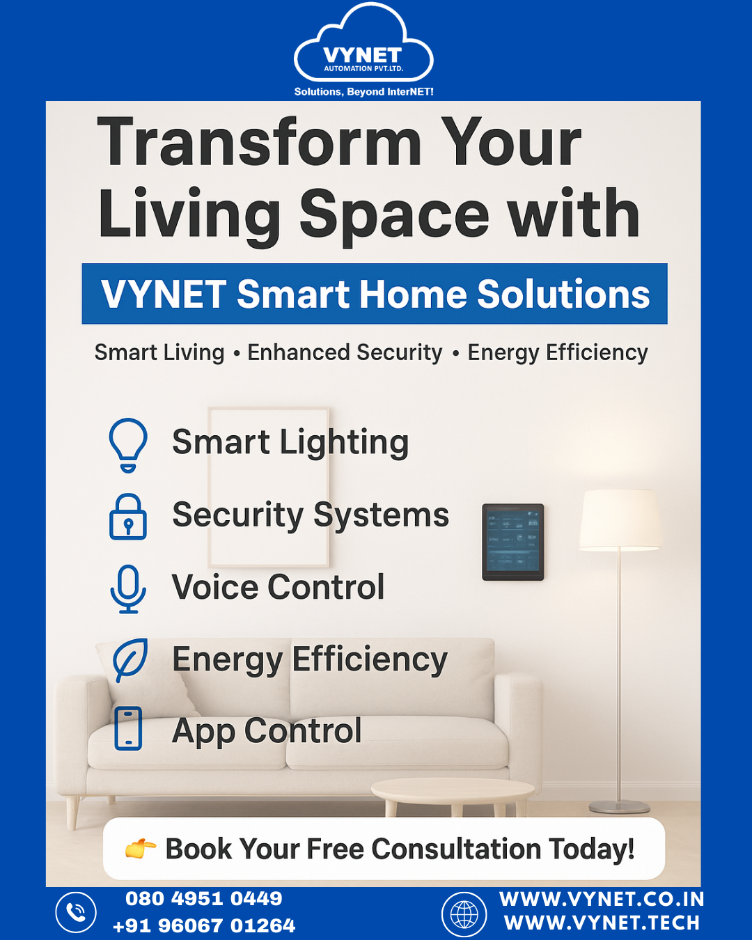 VYNET Automation Pvt. Ltd. is a CEDIA Certified Smart Home Automation Company based in Domlur, Bangalore. We integrate technology and lifestyle through intelligent automation — delivering seamless control, security, and entertainment for homes and businesses across Bengaluru.